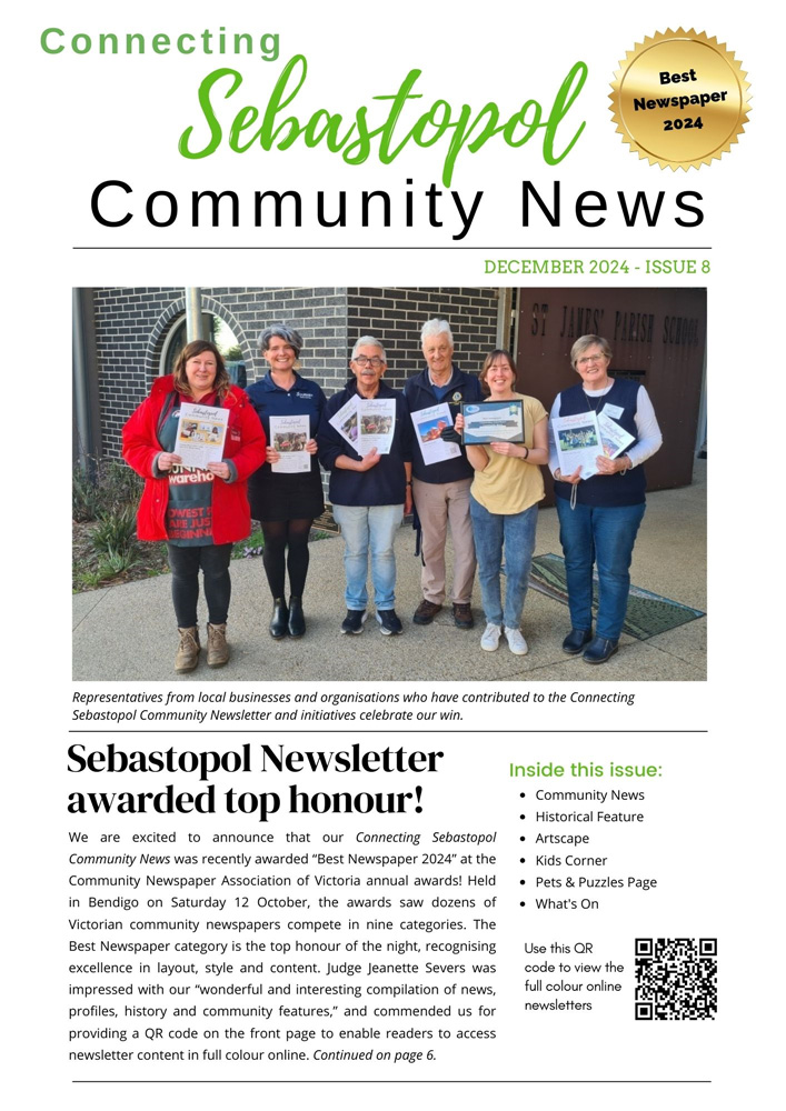 In 2024, the newsletter was awarded the top honour at the Community Newspaper Association of Victoria (CNAV) Annual Awards, being presented with the title of 'Best Community Newspaper 2024'. Read more about our win here: Connecting Sebastopol Newsletter awarded top honour! In 2025, we celebrated another win at the CNAV Awards, being presented with the award for ‘Best Sports Reporting’ for an article by the Sebastopol Football Netball Club. Read more about that win here: Sebastopol Newspaper wins sports award.