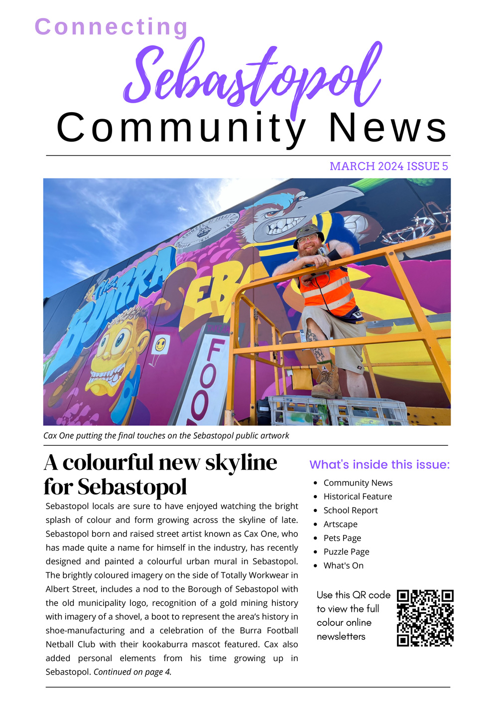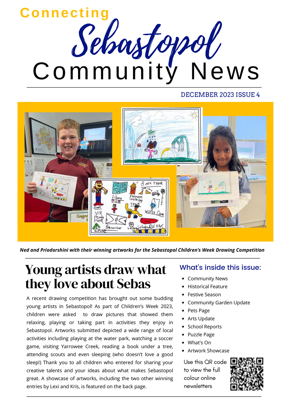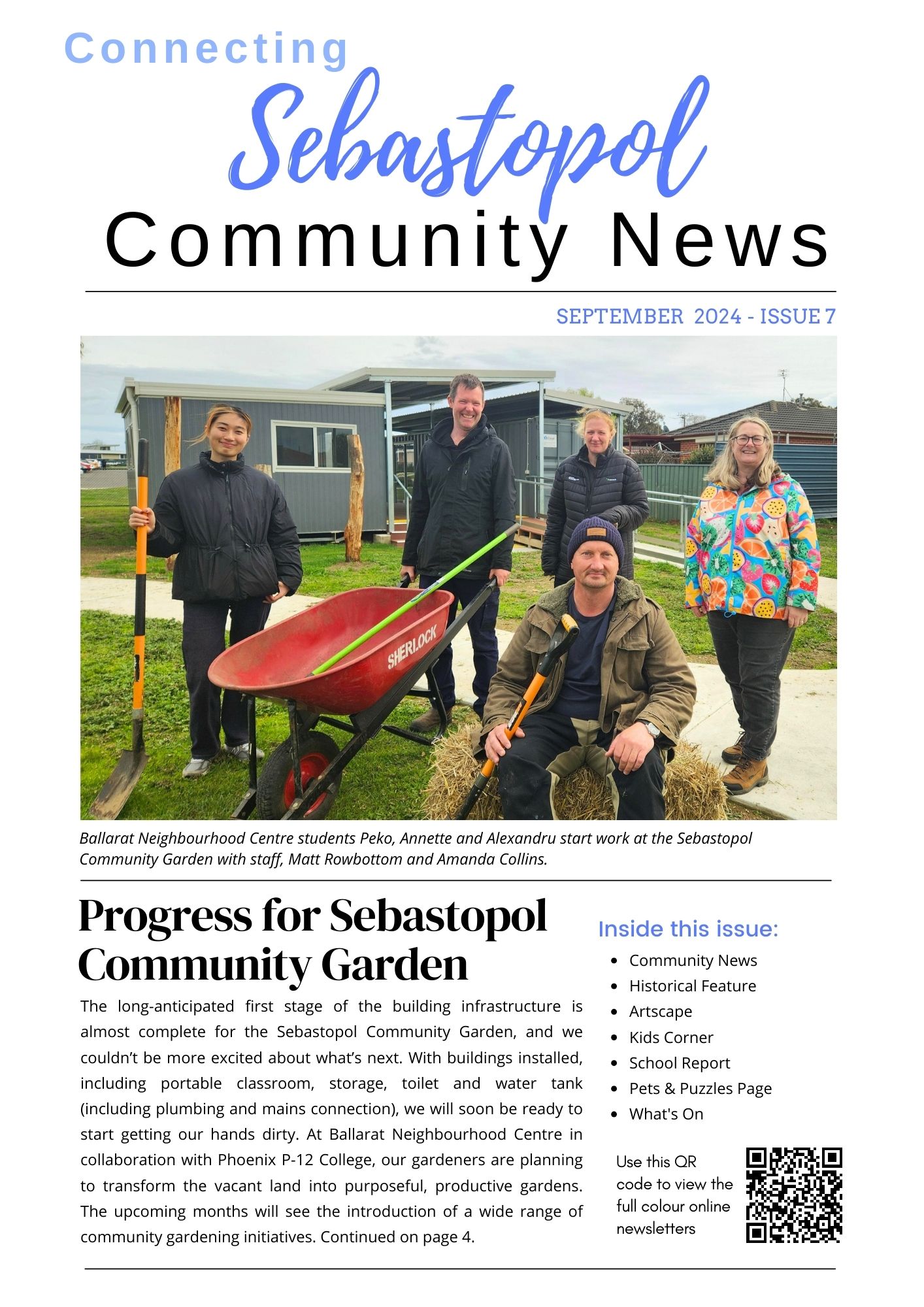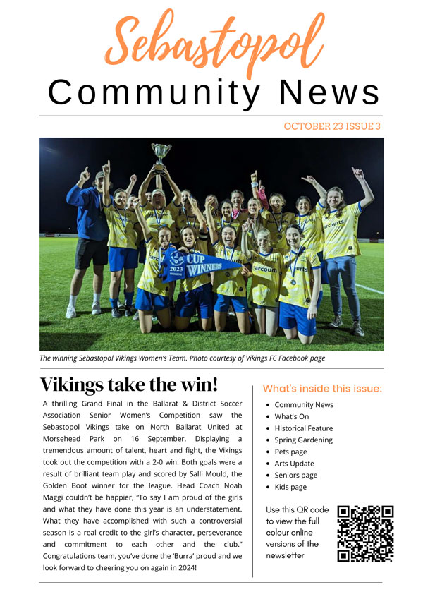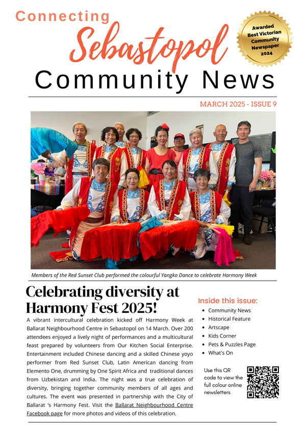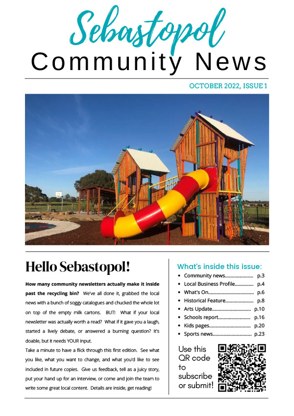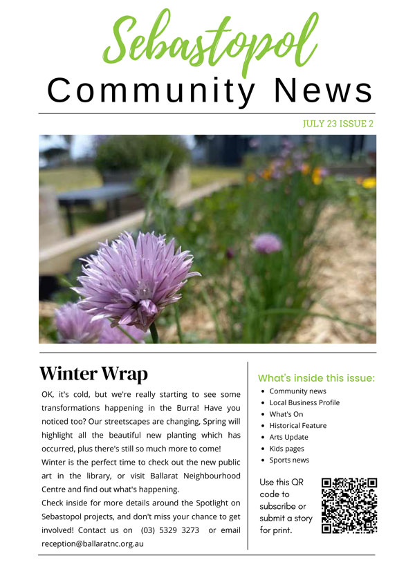 The Connecting Sebastopol Community News is a project of the Ballarat Neighbourhood Centre. The newsletter was established with funding from Spotlight on Sebastopol, a partnership between Regional Development Victoria and the City of Ballarat, with the first issue published in October 2022.