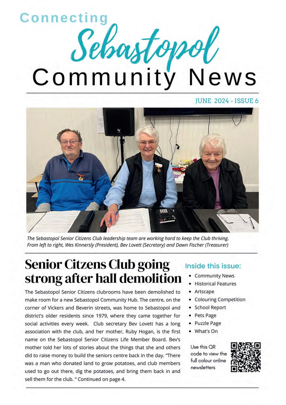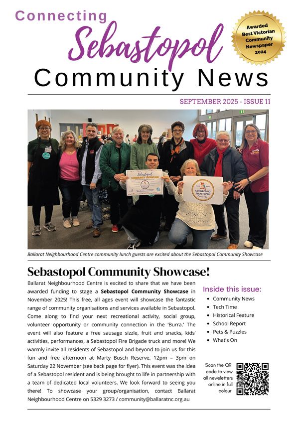 The Connecting Sebastopol Community Newsletter is a project of the Ballarat Neighbourhood Centre and was established with funding from Spotlight on Sebastopol, a partnership between Regional Development Victoria and the City of Ballarat. The first issue was published in October 2022 and since then has gone from strength to strength, growing in volunteer numbers, with each quartely publication now reaching over 3000 Sebastopol households.